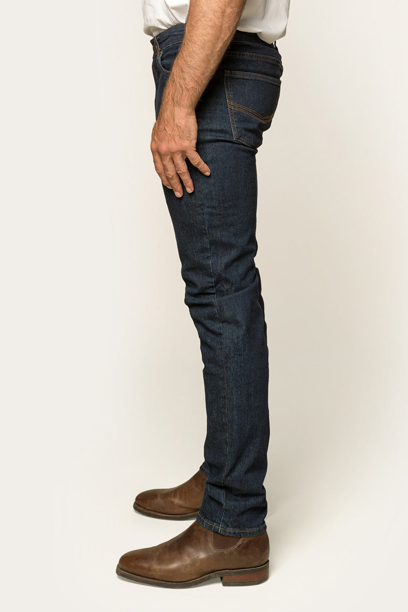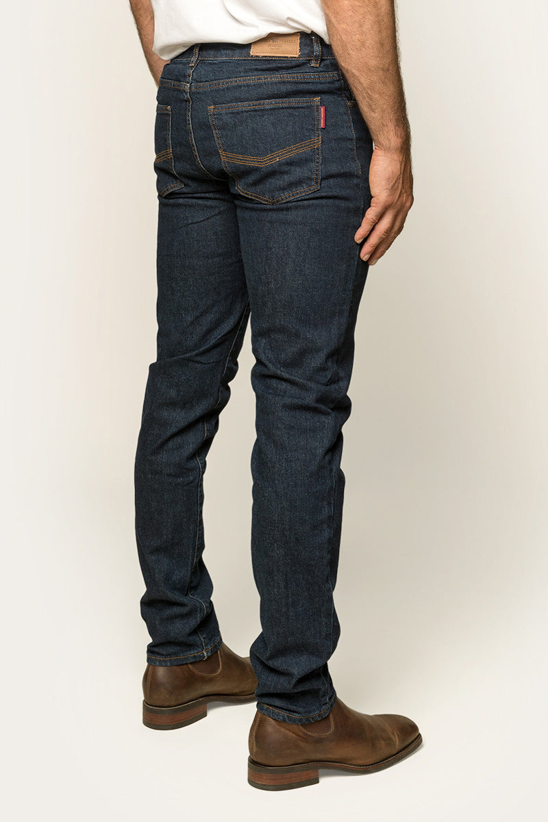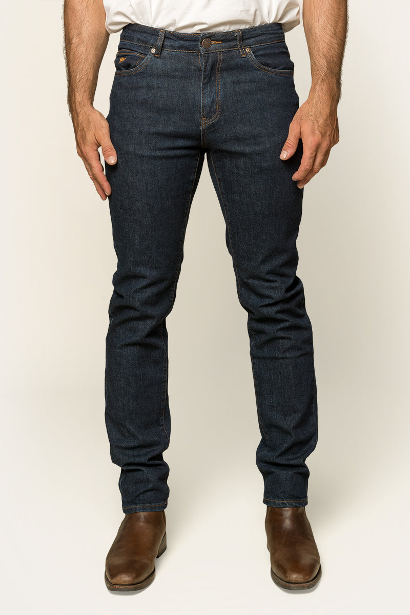 Burke Men’s Tapered Slim Leg Jeans strike a perfect balance between style and practicality. Designed with a mid-rise fit that sits just below the belly button, they give you that ideal fit around the midsection without being too snug or too loose. They provide ample room through the seat and thigh, narrowing down to a refined taper from the knee to the ankle. This design ensures a sleek profile without limiting movement, thanks to a sturdy cotton blend fabric enhanced with elastane for extra flexibility. Featuring a traditional five-pocket style, embroidered bull on the coin pocket, and branded leather patch, these superior-quality men's jeans bring a timeless feel with a contemporary twist. Slip into your favorite Kununurra boots, and you’re set to make a statement wherever you go.