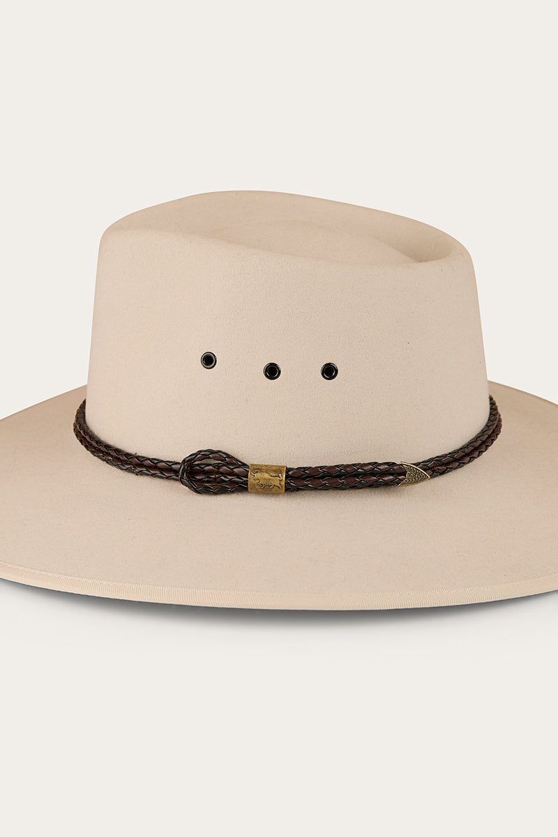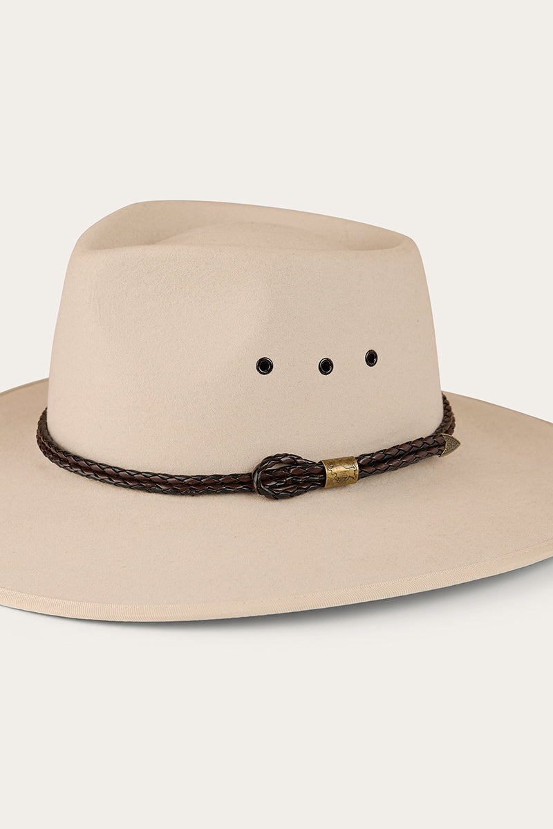 The Minamurra features a Cassidy style crown, complemented with a braided faux leather band, adding elegance and country charm to any outfit. The internal crown is lined with luxurious silk, while the genuine leather sweatband ensures a comfortable and secure fit, ideal for all-day wear amongst the elements. Finished with an antique brass logo, the Minamurra hat strikes the perfect balance between functionality and timeless style, making it a must-have for anyone looking to embrace authentic Australian western hats.